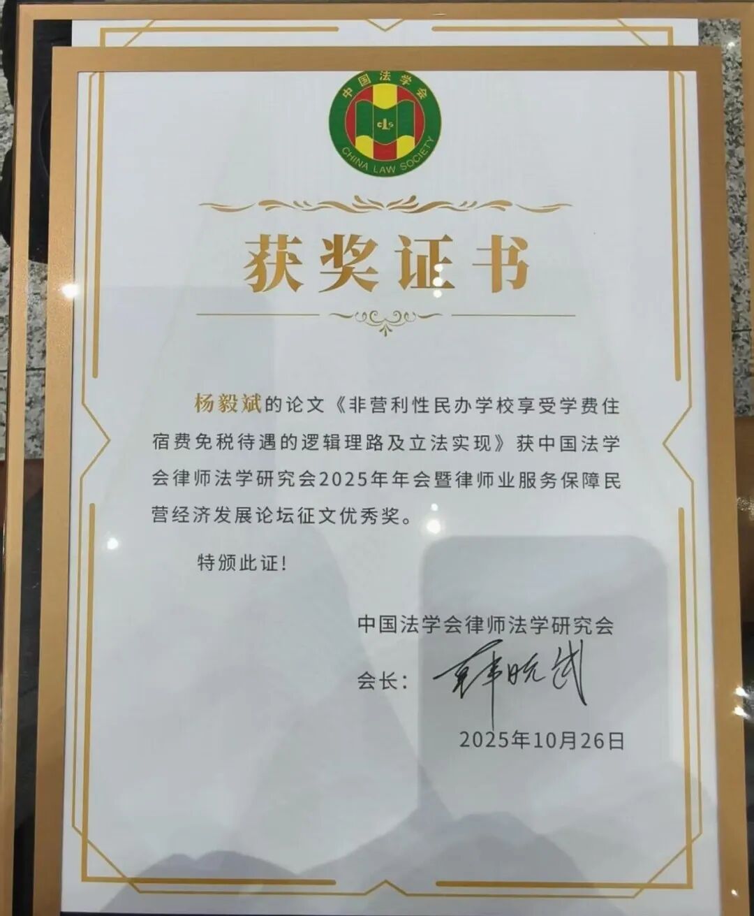 盈进律师杨毅斌荣获“中国律师法学会2025年年会暨律师服务保障民营经济发展论坛”优秀论文奖