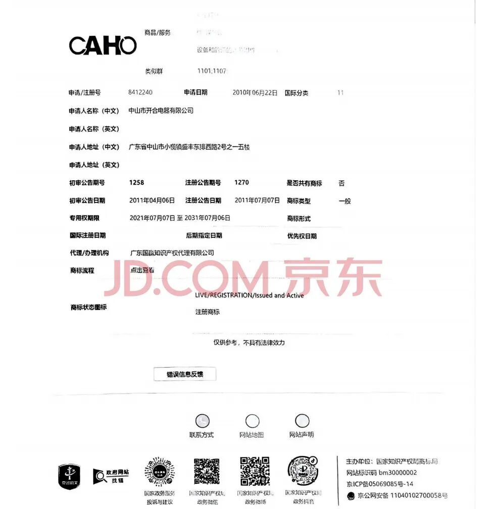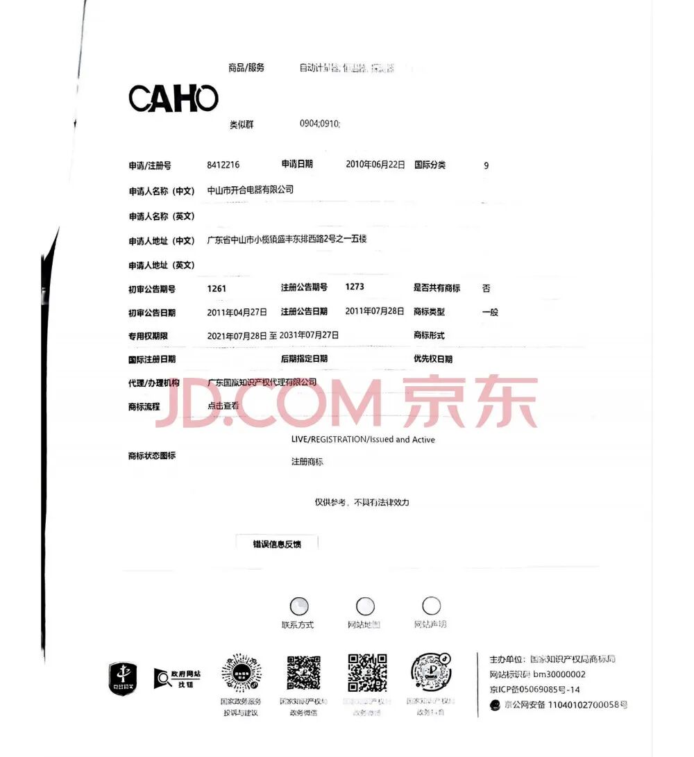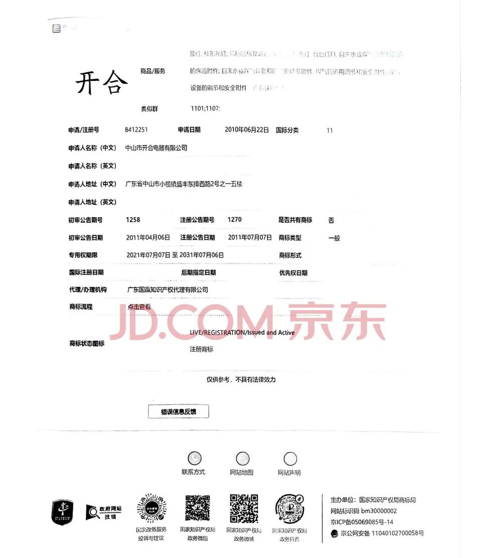 2、中山市开合电器有限公司名下的商标1个。(注册号8412240)