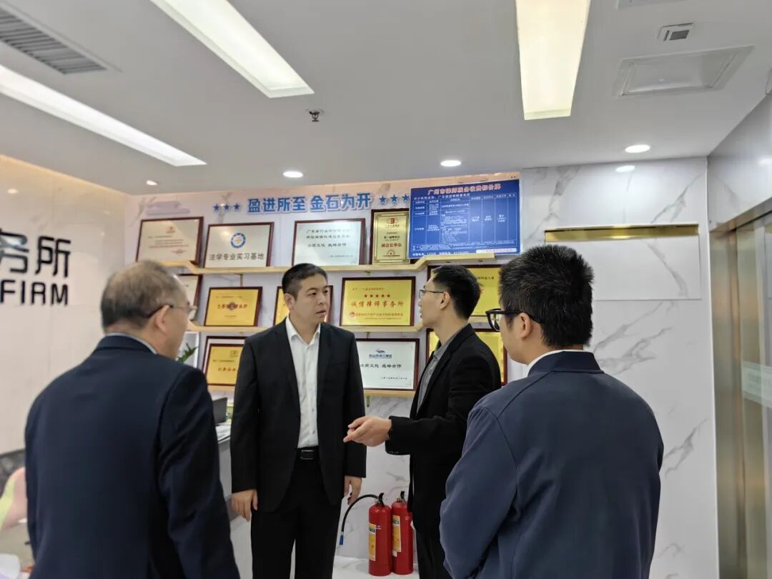 伊始,唐犀院长、吴文驰主任相继参观了我所的办公场地、见证中心等,同步杨毅斌律师从律所概况及发展历程、党建引领、组织机构、主要荣誉、核心业务等方面向在场人员汇报盈进律所情况。