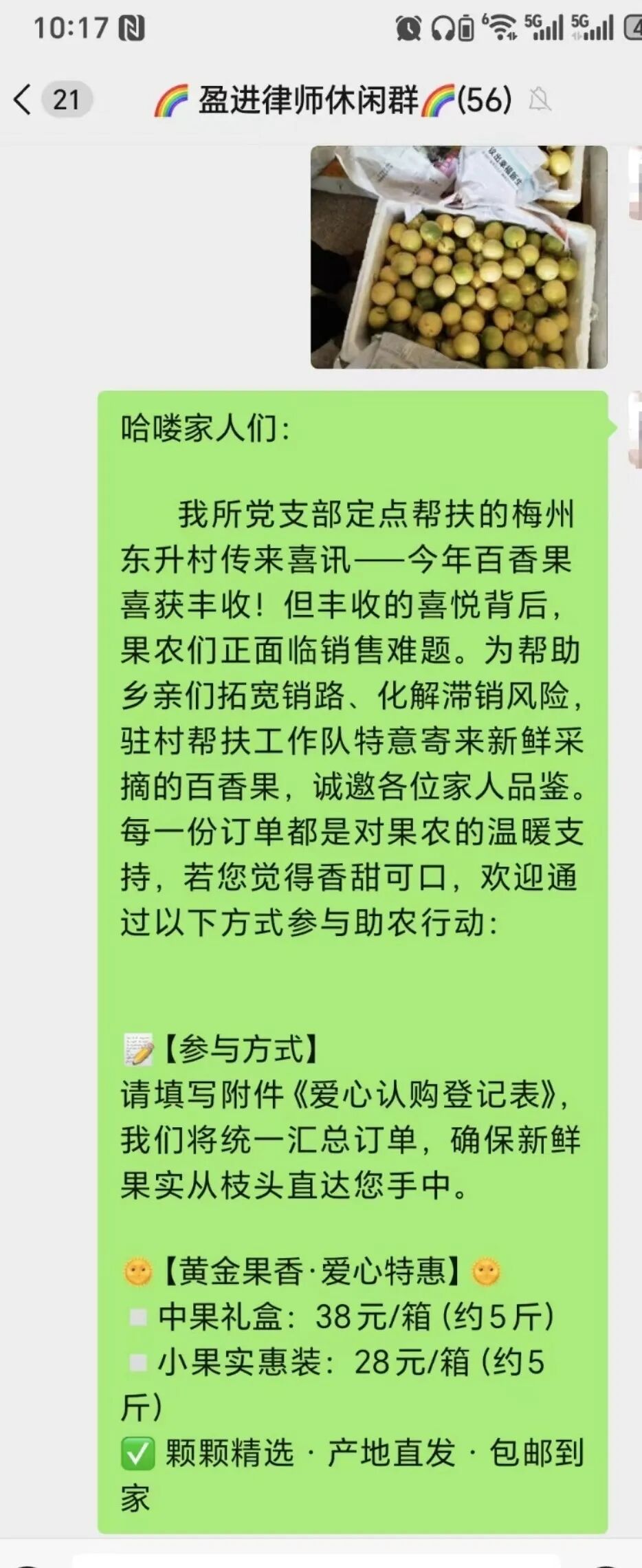 危急关头显担当。盈进党支部迅速行动,向全体党员及盈进三所发起“以购代帮”倡议。消息一出,律师们踊跃下单,用实际行动解果农燃眉之急。刘通书记表示:“法律人既要守护公平正义,更要勇担社会责任。未来,我们将深化‘法律+产业’帮扶模式,为乡村振兴注入更多盈进力量。”