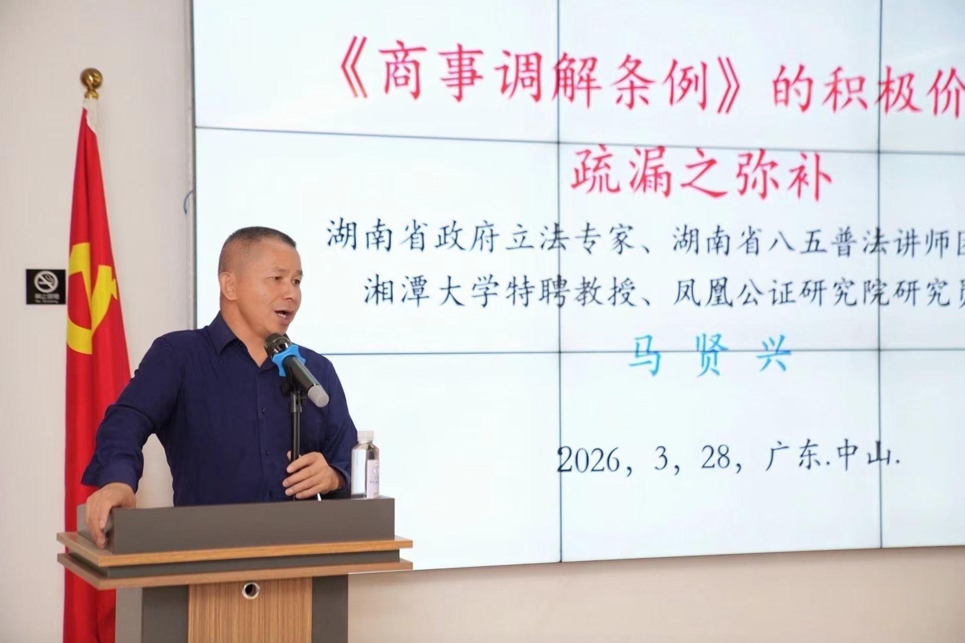 学术与实务的碰撞成为庆典亮点。湘潭大学特聘教授、知名法律学者马贤兴以《商事调解条例的积极价值与疏漏之弥补》为主题展开演讲,结合立法实践与典型案例,深入剖析商事调解的制度优化路径,引发与会者热烈讨论。